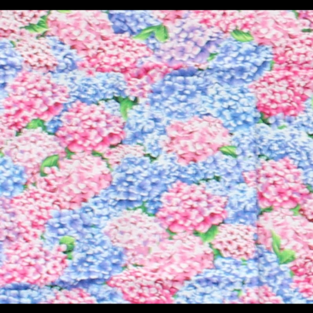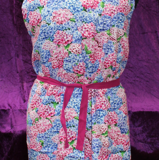 Handmade Apron with a design of a flower Hydrangea in pink and blue with a webbing strap around the middle making it fully adjustable in size.