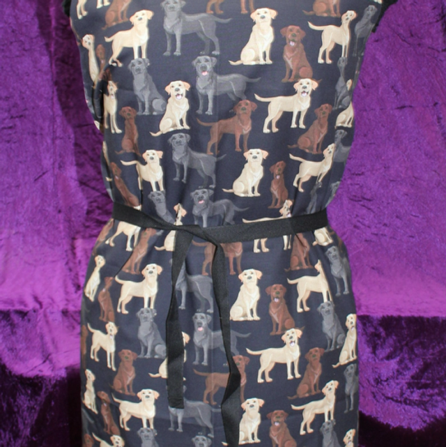Hone made Apron in a Labrador dog design print in a cotton fabric Has tie cotton webbing straps around the middle making it adjustable for size. Can be used in the kitchen for cooking or for arts and crafts Measurements at the widest point is approximately 30 inches and the length is approximately 28 inches