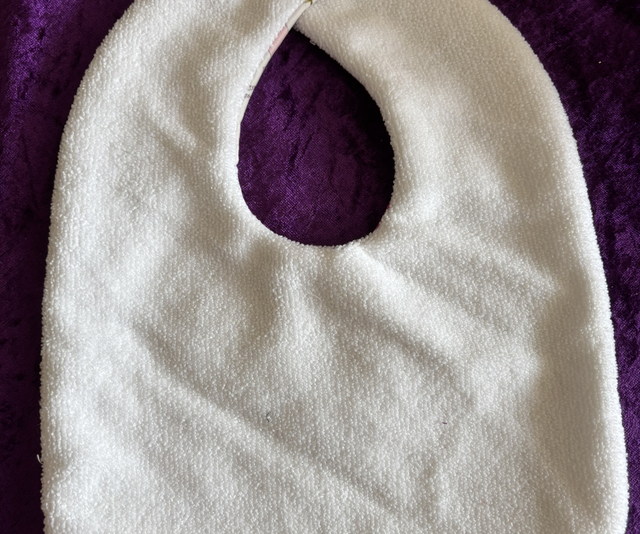 Baby bib in the design of animals on a white background with a white towelling on the back to absorb spillage. It has a plastic popper to attach both side of the bib around the neck area