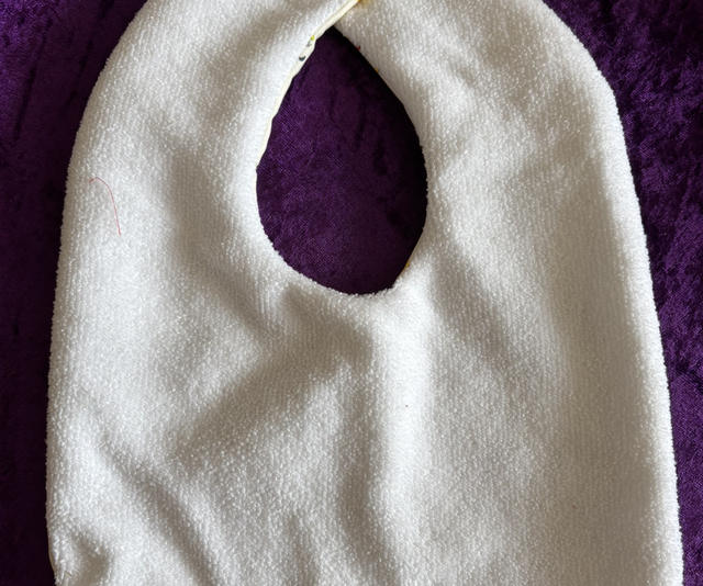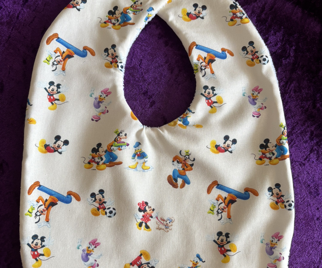 Baby bib in the design of Mickey Mouse and Friends on a cream background with a white towelling on the back to absorb the spillage. It has a plastic popper to attach both sides of the bib around baby’s neck area