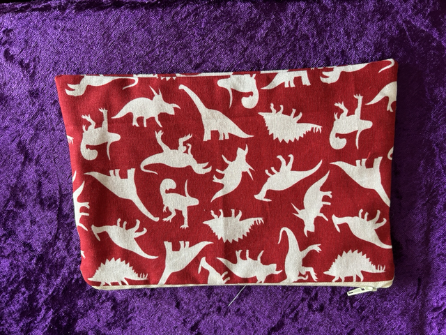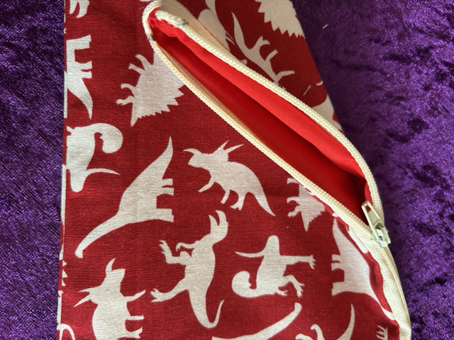 Pencil Case in the design of cream dinosaurs on a red background with a red lining