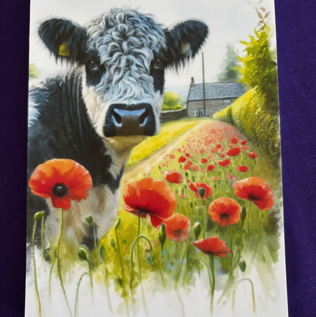 The front cover is a picture of a black/ white cow in a poppy field