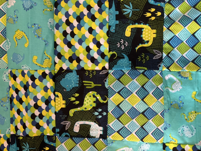 This quilt is a dinosaur design in blue, yellows and blacks with a blue backing inside is a light weight wadding for warmth and comfort