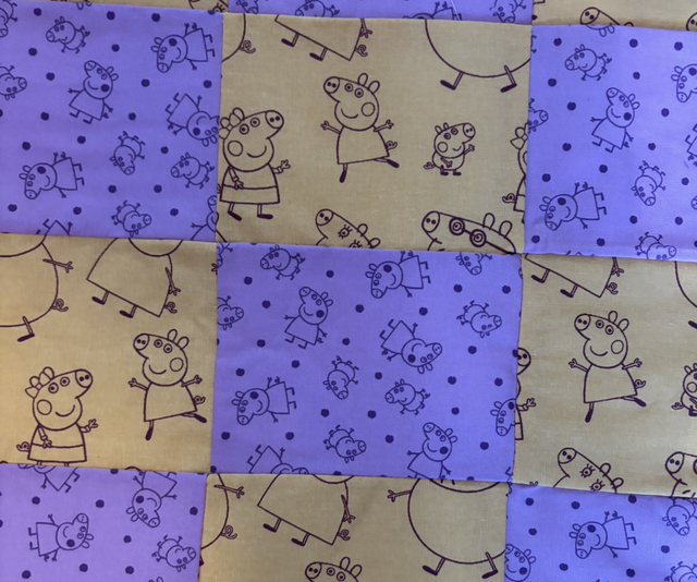 This quilt is a design of Peppa Pig and friends in a square pattern with a purple backing inside is a light weight wadding for warmth and comfort